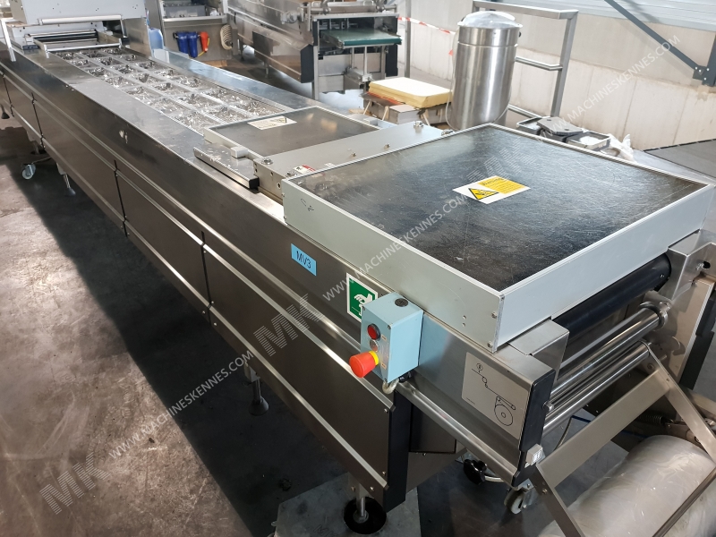 This used Multivac R230 Thermoformer is built in 1999. The machine has a film width of 420mm and there is a dye set on the machine with an exit of 295mm. The format is now divided in a 3.1 format. The machine is equipped with 1 format. This format can be used for Soft Folie packaging. The format does not have a stamp. The frame of the machine is currently 6700mm long, but we can always adjust this to the dimension you need.