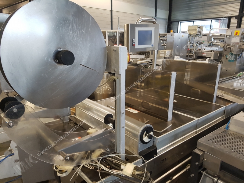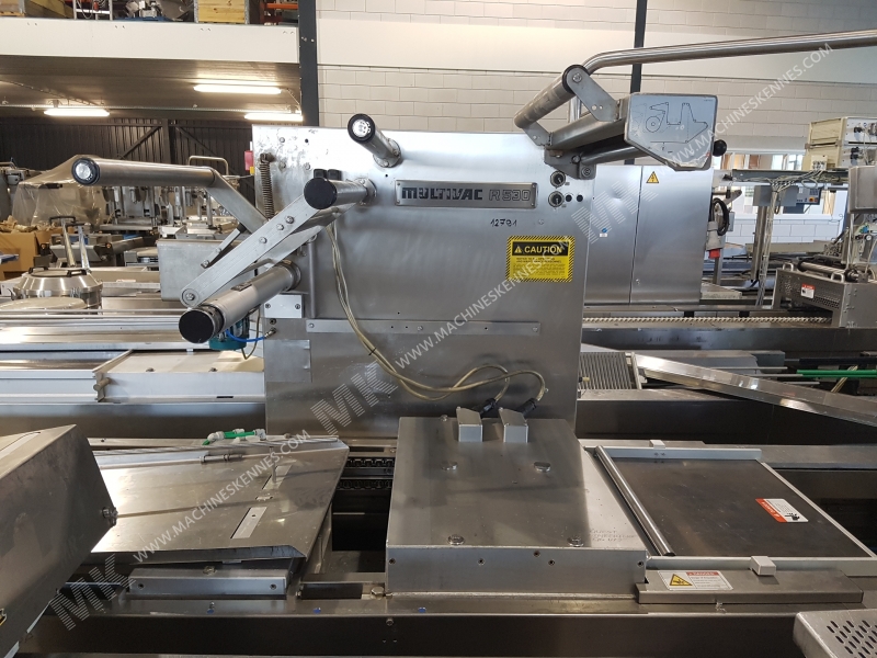 Deze gebruikte Multivac R530 Dieptrekmachine is van bouwjaar 2000. Op de PLC staan 20000 draaiuren. De machine heeft een foliebreedte van 580mm en er is een formaat geplaatst met een afslaglengte van 500mm. Het formaat is nu opgedeeld in een 3.2 indeling. De machine is voorzien van 1 formaat. Dit formaat kan voor Zacht- en hardfolie verpakkingen gebruikt worden. Het formaat beschikt niet over een stempel. Het frame van de machine is op dit moment 9000mm lang, maar kunnen wij altijd naar wens aanpassen.
